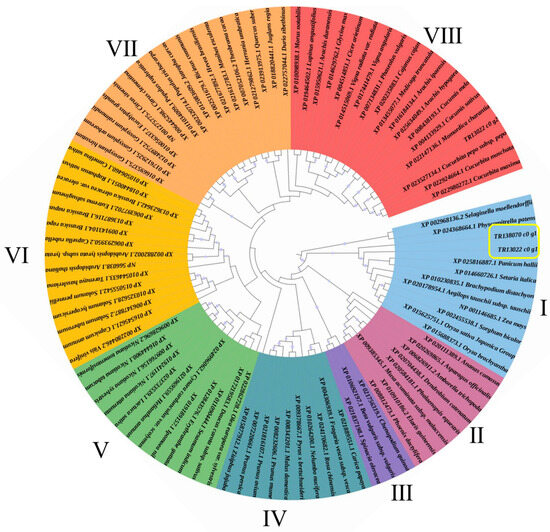 Phylogenetic tree of the TR138070_c0_g1, TR13022_c0_g1, and TR13022_c0_g2 and pectinesterase gene in multiple species. Phylogenetic distance calculated using the MEGA 6 program and the Maximum Likelihood (ML) method using a bootstrap value of 500. Based on the protein sequence similarities between different species, the members were divided into 8 groups (I–VIII). The yellow box is the TR138070_c0_g1 and TR13022_c0_g1 genes.