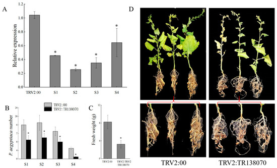 Effect of TR138070_c0_g1 silencing on P. aegyptiaca parasitism. (A) Transcript level of TR138070_c0_g1 in TRV2:TR138070-silenced line using P. aegyptiaca tissues at different stages (S1, S2, S3, and S4). The expression level of each gene is displayed after normalization with the internal housekeeping gene PaTubulin1. All analyses were performed using three biological replicates. Data are represented as the average ± SE (n = 3). (B) Number of P. aegyptiaca at different stages (S1, S2, S3, and S4) attached to the TRV2:00 and TRV2:TR138070 host. (C) Fresh weight of P. aegyptiaca attached to the TRV2:00 and TRV2:TR138070 host. (D) Effect of TRV2:TR138070 silencing on the development of P. aegyptiaca compared to the vector (TRV2:00) line. Bars represent the average ± SE (n = 5) value from two different experiments with five independent host plants. Statistical differences were calculated with Student’s two-tailed t-test (p < 0.05). The asterisk on the bar indicates a significant difference between the TRV2-mediated silenced line (TRV2:TR138070) compared to the vector control plants (TRV2:00).
