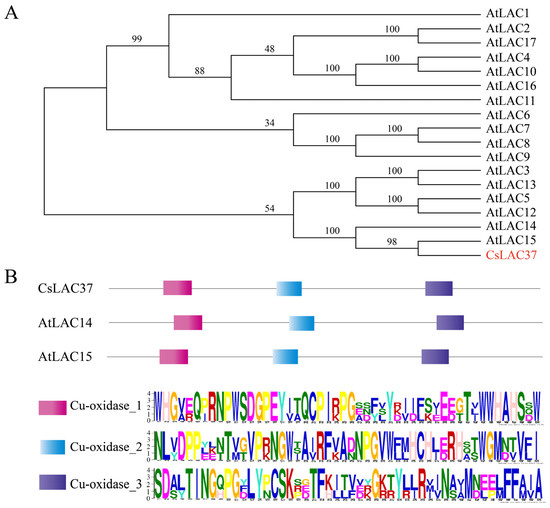 Identification and structural analysis of CsLAC37. (A) Phylogenetic tree based on amino acid sequences of CsLAC37 and 17 AtLACs from Arabidopsis thaliana. The candidate gene CsLAC37 from Camellia sinensis was marked in red. The phylogenetic tree was constructed by MEGA 11.0 with the neighbor-joining algorithm and a bootstrap of 1000. (B) Conserved domains of the CsLAC37, AtLAC14, and AtLAC15 proteins were visualized by the website MEME (https://meme-suite.org/meme/tools/meme) accessed on 30 October 2023. The red, blue, and purple rectangles represent Cu-oxidase_1, Cu-oxidase_2, and Cu-oxidase_3, respectively. The larger the letter, the higher the conservation of the site based on the website.