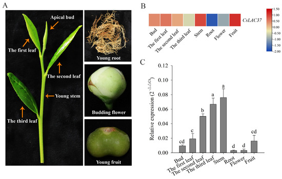 Tissue-specific expression pattern of CsLAC37. (A) Pictures of eight different tissues, including the bud, first leaf, second leaf, third leaf, young stem, young root, budding flower, and young fruit. (B) Heatmap of CsLAC37 in eight different tissues based on transcriptome data. (C) Expression levels of CsLAC37 in eight tissues based on qRT-PCR. A one-way analysis of variance with Duncan’s multiple-range test was performed. Different letters above the bars represent significant differences at p < 0.05.