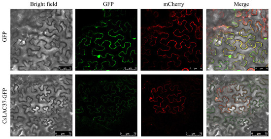 To further understand the molecular function of the CsLAC37 protein, we transferred the CsLAC37-GFP recombinant plasmid into Agrobacterium cells to infect tobacco leaves, and the GFP empty plasmid was the control. A bright field showed the cell contour of the tobacco leaves, and mCherry was the positive control. The results showed that the CsLAC37 protein was mainly localized in the cell membrane (Figure 3).