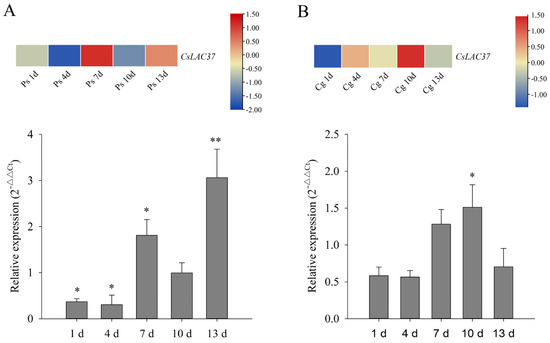 Expression analysis of CsLAC37 in response to fungal pathogens. (A) Expression pattern of CsLAC37 in response to Pestalotiopsis-like species infections based on transcriptome analysis and qRT-PCR. (B) Expression pattern of CsLAC37 in response to C. gloeosporioides infections based on transcriptome analysis and qRT-PCR. The asterisks indicate the significance level (* p < 0.05 and ** p < 0.01) based on a Student’s t-test. Samples were harvested at 1, 4, 7, 10, and 13 d under both Pestalotiopsis-like species and C. gloeosporioides infections.