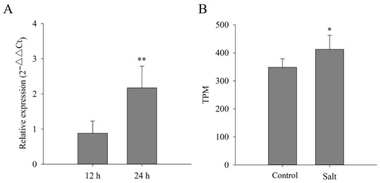 Expression analysis of CsLAC37 under cold and salt treatments. (A) Relative expression level of CsLAC37 under cold (4 °C) treatment by qRT-PCR. (B) Relative expression level (TPM value) of CsLAC37 under salt treatment based on transcriptome data. Samples were collected at 12 and 24 h under cold treatment and 4 h under salt treatment. One or two asterisks indicate significant differences of p < 0.05 and p < 0.01, respectively, based on a Student’s t-test.