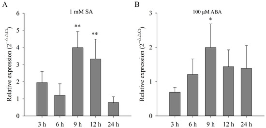 Expression analysis of CsLAC37 under SA and ABA treatments. Relative expression level of CsLAC37 (A) under SA and (B) ABA treatments. Samples were collected at 3, 6, 9, 12, and 24 h under both SA and ABA treatments. Based on a Student’s t-test, one or two asterisks represent significant differences of p < 0.05 and p < 0.01, respectively.