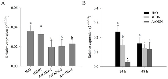 Selection of probes and optimal time points for antisense oligodeoxynucleotides (AsODNs). (A) Relative expression level of CsLAC37 under AsODN by three different probes. (B) Relative expression level of CsLAC37 at 24 h and 48 h under AsODN by probe AsODN-1. Both H2O and sODN were used as the controls. Different letters represent significant differences at p < 0.05 based on Duncan’s multiple-range test.