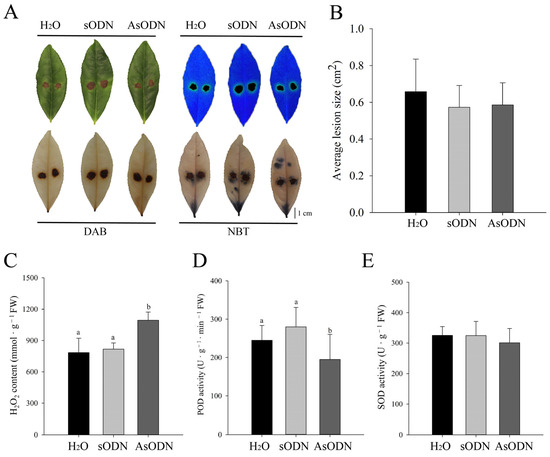 After AsODN treatment for 24 h, the second leaf was infected by C. gloeosporioides. As shown in Figure 8A, lesions on the leaves were observed under normal conditions (upper left corner), fluorescent light (upper right corner), DAB staining (lower left corner), and NBT staining (lower right corner). However, no significant difference was observed in the lesion morphology and area on the leaves among the different treatments (H2O, sODN, and AsODN) (Figure 8A,B). Furthermore, three critical biochemical parameters including the H2O2 content, POD activity, and SOD activity were measured. Although the SOD activity varied insignificantly, the H2O2 content increased clearly, and the POD activity decreased significantly (Figure 8C–E). The results showed that the leaves were damaged more severely, and POD activity decreased after AsODN treatment of CsLAC37 compared to the controls, indicating that CsLAC37 plays an important role in resistance to anthracnose disease.