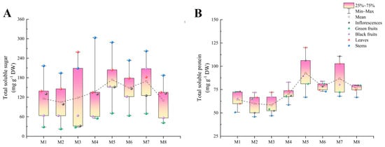 The cultivar with the highest total soluble sugar content was M5 (173.64 mg g−1 DW), while M2 (104.83 mg g−1 DW) exhibited the lowest content. The stems, except for those of M3, had the highest total soluble sugar contents, which were significantly higher than those of the other organs, followed by the leaves, inflorescences, black fruits, and green fruits. The difference between the stems and green fruits in the eight cultivars varied from 3.7 to 7.6 times. In most cultivars, the black fruits contained significantly more total soluble sugar than the green fruits (1.1 to 3.0 times more) (Figure 2A).
