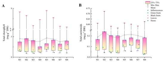M5 exhibited a significantly higher total chlorophyll content than the other cultivars (2.81 mg g−1 DW), while the cultivar M7 had the lowest total chlorophyll content (2.24 mg g−1 DW). The total chlorophyll contents were highest in the leaves, followed by the stems, green fruits, and black fruits (except in M2 and M3), while the inflorescences (except in M5 and M7) had the lowest contents. Meanwhile, the total chlorophyll contents in the leaves ranged from 6.28 mg g−1 DW (M8) to 8.68 mg g−1 DW (M5), and in the inflorescences, they ranged from 0.56 mg g−1 DW (M3) to 1.29 mg g−1 DW (M7), with the largest difference between the leaves and inflorescences being 13.8-fold in M2 (Figure 3A).