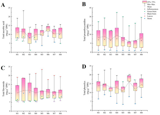 The total flavonoid contents in the eight cultivars ranged from 14.32 mg g−1 DW (M4) to 16.45 mg g−1 DW (M3). Moreover, the total flavonoid contents in the leaves were higher than those in the inflorescences, except in M3, where the situation was reversed. No significant differences were observed in the total flavonoid contents among the stems, green fruits, and black fruits in most cultivars (Figure 4C).