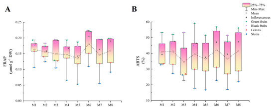 M6 (42.46%) showed the highest ABTS level, while the lowest ABTS level was found in M3 (34.51%). Meanwhile, the highest ABTS levels were observed in the green fruits (43.39–59.16%), and the ABTS levels in the black fruits were significantly lower than those in the green fruits, while the opposite was observed in M3 and M7. The lowest levels were observed in the stems (except in M3), ranging from 16.84 to 32.72%. In addition, the inflorescences exhibited significantly higher levels than the leaves, except in M3 (Figure 5B).