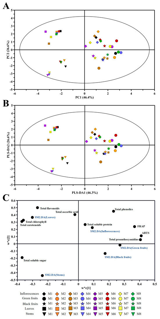 The first component (PC1) explained 46.4% of the variance, and the second component (PC2) explained 26.6%. In addition, PC1 distinguished three groups: the first group was leaves and stems, the second group was inflorescences, and the last group was green fruits (except in M3). PC2 distinguished two groups: one was leaves and inflorescences, and the other was stems and black fruits (except in M6) (Figure 6A).
