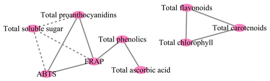 Plot of the correlations between nutritional components and antioxidant capacity in eight cultivars of Basella alba. All correlations in the figure reflect absolute values of the Pearson correlation coefficient above the threshold (R2 > 0.65). Solid lines indicate positive correlations, while dashed lines indicate negative correlations.