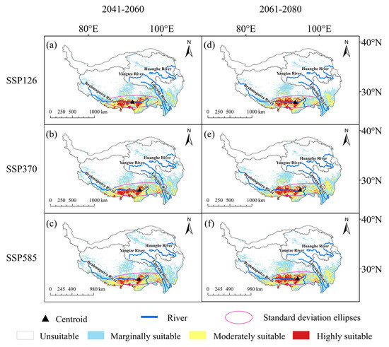 Potential suitable areas of Cupressus gigantea W. C. Cheng & L. K. Fu. (a) 2041–2060: SSP126; (b) 2041–2060: SSP370; (c) 2041–2060: SSP585; (d) 2061–2080: SSP126; (e) 2061–2080: SSP370; (f) 2061–2080: SSP126.