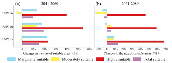 Under future climate change scenarios, the potential suitable areas of C. gigantea were projected to expand. From 2041 to 2060, both the SSP126 and SSP580 scenarios showed similar patterns in the changes of potential suitable areas. Specifically, there was a significant expansion in the marginally and highly suitable areas, while the moderately suitable areas showed a slight contraction. In general, the potential suitable areas tended to expand, with expansion rates of 9.7% and 14.9%, respectively (Figure 2a,c and Figure 3a). In Scenario SSP370, all habitats showed an increasing trend, with the highest increasing rate of 54.2% for the highly suitable areas (Figure 2b and Figure 4a). From 2061 to 2080, the SSP126 scenarios predominantly indicated a contraction in the marginally and moderately suitable areas of C. gigantea, while the highly suitable areas expanded. The overall suitable areas experienced a slight contraction of 3.6%, making it the only scenario to exhibit a contraction trend (Figure 2d and Figure 3b). In the SSP370 scenario, the marginally and highly suitable areas expanded primarily, while the moderately suitable areas showed a slight contraction (Figure 2e and Figure 3b). Under the SSP585 scenario, all suitable areas expanded, with a total increasing rate of 13.2% (Figure 2f and Figure 3b).