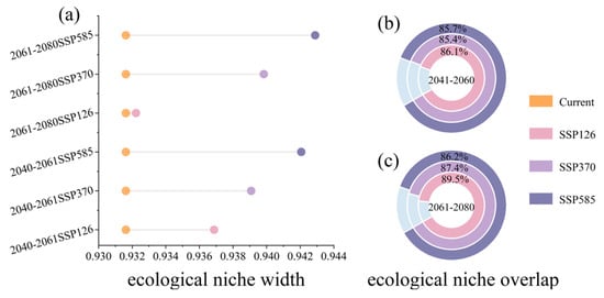 Ecological niche width and ecological niche overlap. (a) Ecological niche width; (b) ecological niche overlap: 2041–2060; (c) ecological niche overlap: 2061–2080.