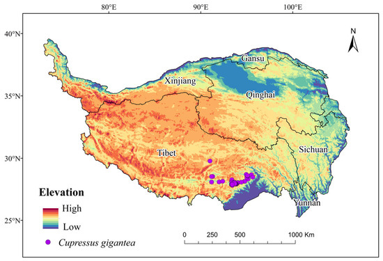 - Zheng, W.; Xue, H.; Luo, D.; Wang, J.; Luo, J. Eco-geographic distribution and coenology characteristics of Cupressus gigantea. Sci. Silvae Sin. 2007, 43, 8–15. [Google Scholar]
