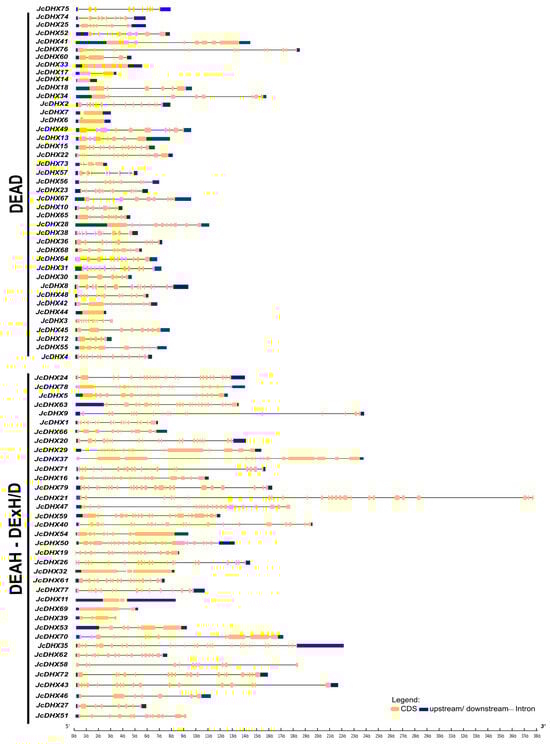 3.1. Identification of JcDHX Genes and Their Gene Structures