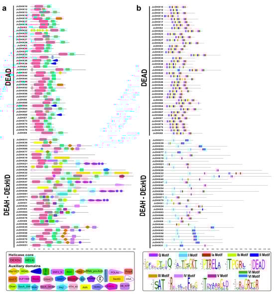 3.5. Conserved Domains and Motifs in JcDHX Proteins