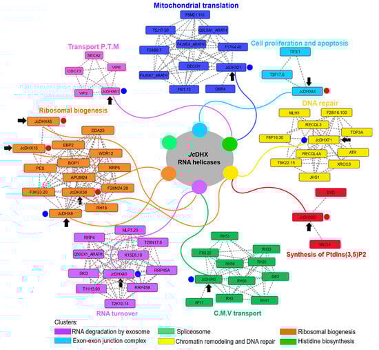 2.7. Protein–Protein Interaction (PPI) Networks for JcDHX Candidates