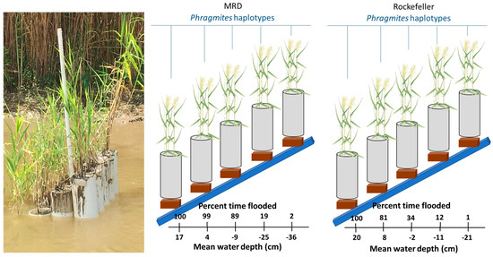 Wetland plants are generally adapted to flooded conditions; however, SLR can induce stress by increasing the amount of time the plants experience anoxic conditions. In particular, a lack of oxygen in marsh soils contributes to the buildup of toxic sulfides and volatile fatty acids in the porewater, which can cause a reduction in growth and mortality at high concentrations [19,20,21]. Marsh organ studies are valuable for testing how rising sea levels impact plant performance [22,23,24]. Spartina alterniflora Loisel. biomass exhibits a parabolic relationship with flooding, with the highest productivity at a moderate level of inundation in North Inlet, South Carolina [22,25]. However, along the northern Gulf of Mexico coast, the productivity of S. alterniflora declined with an increase in flooding [22], these divergent responses are likely associated with a lower tidal range on the Gulf Coast. For brackish species such as Spartina patens (Ait.) Muhl., flood stress compounds salinity stress such that greater flood duration more dramatically reduces plant growth under higher salt concentrations [22]. Using marsh organs to explore P. australis response to SLR is crucial, as P. australis occurs across much of the high marsh along the US Atlantic and Gulf Coasts and has been shown to play an important role in salt marsh transgression [26]. In particular, P. australis inhibits the landward expansion of salt marsh under low-salinity conditions, while high salinities significantly favor the growth of salt marsh grasses over that of P. australis [26]. While in many areas, land managers are interested in the conditions to control or eliminate its spread, P. australis is valued in the Mississippi River Birdsfoot Delta, where rates of relative SLR are extremely high for its ability to stabilize marshes, trap mineral sediment, and build marsh elevation through organic accretion [27,28]. However, P. australis in the Birdsfoot Delta has recently been experiencing dieback, similar to that documented in Europe and elsewhere [29,30], and many factors have been suggested as the cause, notably, herbivory damage and salinity pulses [31]. Thus, testing the response of P. australis to increasing inundation and salinity will inform the response to SLR, management of invasive haplotypes, as well as potential causes of dieback.