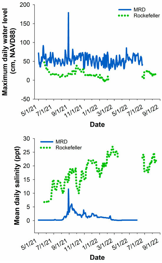 The percent time flooded of each marsh organ elevation level differed slightly from the original targets due to annual variations in water levels. Nonetheless, the pipe elevations captured a wide range of potential flooding durations (3.5–100% in MRD and 3–100% flooded in Rockefeller; Figure 1). Water levels were lower and salinity concentrations were generally much greater in Rockefeller throughout the study duration, as expected (Figure 2).