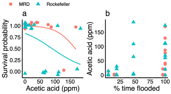 (a) Logistic regression results showing how acetic acid concentration predicts the probability of survival on Phragmites australis in the marsh organs from both the Mississippi River Delta (red circles) and Rockefeller Wildlife Refuge (blue triangles); (b) scatterplot displaying the relationship between percent time flooded and porewater acetic acid concentration in the first growing season.