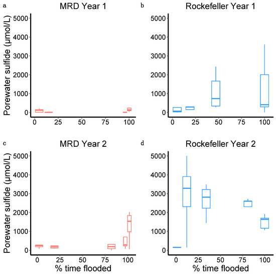 Boxplots displaying the first growing season (a,b) and second growing season (c,d) relationship between percent time flooded and porewater sulfide concentration in the experimental marsh organs placed in the MRD and in Rockefeller Wildlife Refuge.
