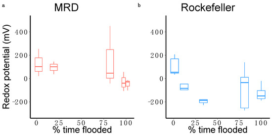 Boxplots displaying the relationship between percent time flooding and redox potential recorded at the end of the second growing season in the Mississippi River Delta (a) and Rockefeller Wildlife Refuge (b).