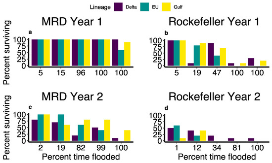 At the end of the second growing season, site and haplotype had a significant interaction in predicting survival, such that EU and Gulf haplotypes survived better in the fresh MRD site compared to Rockefeller (Chisq: 11.57, p = 0.0031; Figure 6c,d). During year two in the MRD, the Delta haplotype had the lowest average survivability at 46%, followed by EU at 60% and Gulf at 72%, while in Rockefeller, Delta had the highest survival at 26%, followed by EU at 16% and Gulf at 10%. Moreover, flooding duration and lineage had a significant interaction during the second growing season (χ2 = 6.73, p = 0.035). While Phragmites' survival generally declined with increased flooding, some haplotypes had a sharper decline than others (Figure 6c,d). Survivorship was greater in MRD than Rockefeller in both growing seasons (Year 1: χ2 = 38.15, p < 0.001; Year 2: χ2 = 25.18, p < 0.0001; Figure 5).