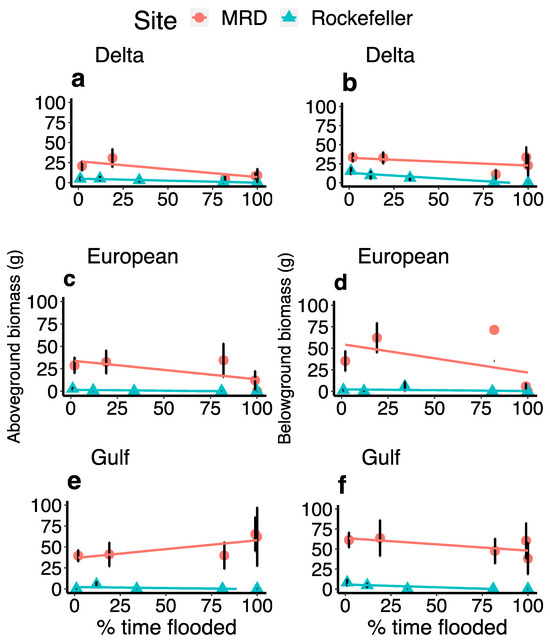 Plots displaying the relationships between percent time flooded and either aboveground or belowground biomass. Plots (a,b) show results from Delta Phragmites, plots (c,d) show European Phragmites, and (e,f) display Gulf Phragmites. The Mississippi River Delta data is represented by red circles, while Rockefeller Wildlife Refuge is represented by blue triangles.