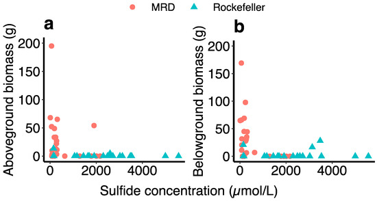 Scatterplots displaying the relationship between sulfide concentration and biomass (g), separated into above (a) and belowground biomass (b).