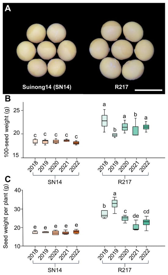 The comparison of 100-seed weight and seed weight per plant between SN14 and large-seed CSSL R217 for 5 years. (A) The seed sizes of SN14 and R217. Bar = 1 cm. (B,C) The phenotypic data of 100-seed weight and seed weight per plant for SN14 and R217 from 2018 to 2022. In (B,C), different lowercase letters (a, b, c, d, and e) indicate significant differences, the threshold is set to p < 0.05, and identical letters suggest insignificant differences in one-way ANOVA.
