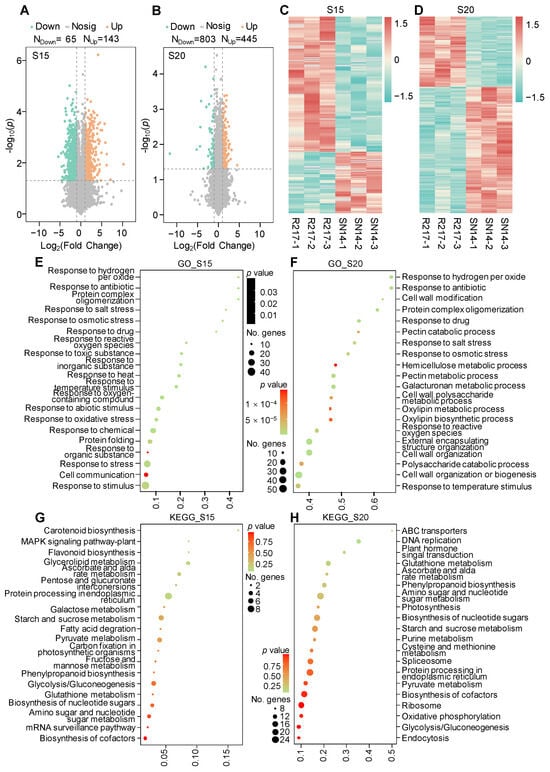 The DEG analysis and KEGG enrichment analysis in R217 and SN14 at S15 and S20 seed developmental stages. (A,B) Volcano map of DEGs at S15 and S20 seed developmental stages, respectively. Down—DEGs with downregulated expression. Up—DEGs with upregulated expression. Nodiff—genes without differential expression in RNA-seq analysis. (C) The heatmap of all DEGs in R217 and SN14 at S15 and S20 seed developmental stages. (D,E) The KEGG enrichment analysis of the top downregulated and upregulated DEGs at the S15 seed developmental stage. (F,G) The KEGG enrichment analysis of the top downregulated and upregulated DEGs at the S20 seed developmental stage. In (D–G), the vertical coordinates represent the GO terms enriched with genes from the substituted segments. The horizontal axis represents the gene ratio. No. genes—the number of genes.