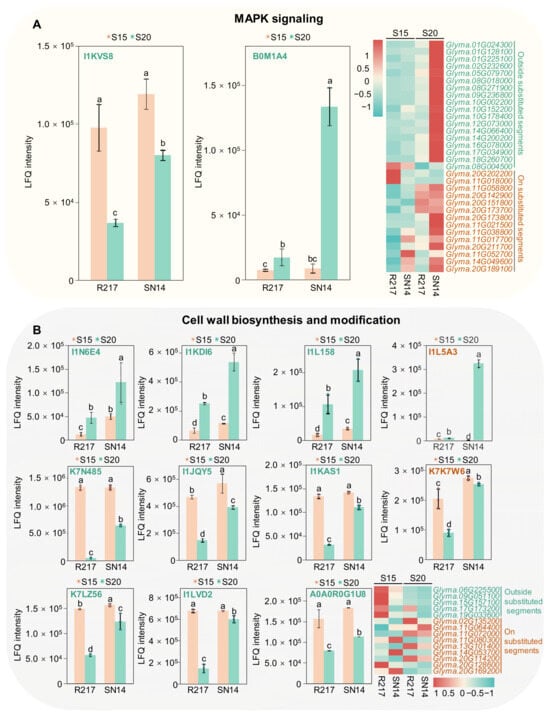 The cell wall biosynthesis process might be another crucial pathway that participates in seed weight regulation. Two DAPs and nine DEGs involved in cell wall biosynthesis and modification were selected from the substituted segments of R217 (Figure 5B). The expression patterns of DEGs and DAPs were quite different between R217 and SN14 at S15 and S20. This indicates that DAPs and DEGs involved in the MAPK signaling pathway and cell wall biosynthesis and modification were direct factors affecting the variation in seed weight. Futhermore, the analysis results of gene expression patterns based on FPKM and LFQ intensity data indicate that nine DAPs and five DEGs outside the substituted segments were involved in cell wall biosynthesis and modification (Figure 5B). Among the aforementioned five DEGs, the expression patterns of four DEGs, namely Glyma.06G225500, Glyma.09G051100, Glyma.15G157100, and Glyma.19G033600 were consistent, with the expression being higher at S15 than at S20 (Figure 5B). The expression level of all five DEGs significantly increased in R217 compared with SN14 at S15 and S20 (Figure 5B). The expression of I1JQY5, I1KAS1, K7LZ56, I1LVD2, and A0A0R0G1U8 was consistent with that of the aforementioned four DEGs (Figure 5B). On the contrary, the expression of four DAPs, namely I1N6E4, I1KDI6, I1L158, and I1L5A3, was lower at S15 than at S20, and the expression levels of the four proteins significantly decreased in R217 compared with SN14 (Figure 5B). The detailed expression and protein abundance data of these candidate genes are also listed (Table S2). The results revealed that DEGs and DAPs related to the MAPK signaling pathway and the cell wall biosynthesis and modification pathway may be the main genes and proteins involved in seed weight regulation. Moreover, these results suggest that DEGs and DAPs located on the substituted segments are direct factors causing the variation in seed weight in R217, including the genes related to the MAPK signaling pathway and the cell wall biosynthesis and modification pathway.