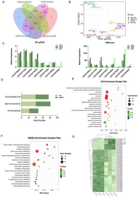 To identify the resistance mechanism of the GhIQD1 gene following infection, we conducted full transcriptomic sequencing (RNA-seq) analysis for 72 h after infection of overexpressing tobacco with V. dahliae. PCA (Figure 5B) investigation exhibited good clustering between the wild-type (WT) and overexpressing (OE) datasets. In this analysis, 25,969 genes were upregulated, and 26,438 genes were downregulated in OE3. In OE6, 26,204 genes were upregulated, and 26,258 genes were downregulated. In OE8, 27,070 genes were upregulated, and 25,587 genes were downregulated. In WT, 25,989 genes were down-regulated and 25,691 genes were up-regulated. We generated Venn diagrams of differential genes (Figure 5A) and identified more differentially expressed genes in overexpressed tobacco, suggesting that a large-scale transcriptome reprogramming event took place in tobacco after inoculation with V. dahliae. To characterize the accuracy of the transcriptome data, we randomly selected four upregulated (LOC107780371, LOC107771705, LOC107830202, and LOC107778533) and four downregulated (LOC107818946, LOC107775283, LOC107780562, and LOC107818654) transcriptome DEGs for RT-qPCR analysis. The findings demonstrated that the expression trends of the two groups of genes were consistent, confirming the accuracy of our transcriptome results (Figure 5C).