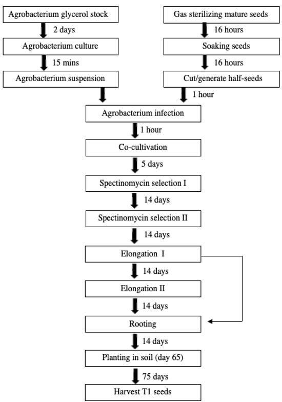 Flow chart of Agrobacterium-mediated transformation using Minimax mature half-seed transformation through to harvest of T1 seeds. Approximately 145-day procedure.