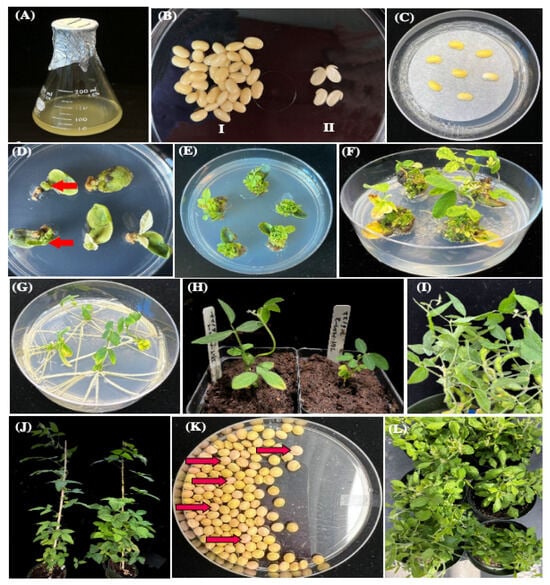 Agrobacterium-mediated soybean transformation workflow. The workflow protocol requires up to nine weeks from seeds to transgenic seedlings (A–G). (A) Agrobacterial culture, (B) (I) Sterile seeds after hydration, (II) seed in ‘half-seed’ configuration ready for transformation). (C) Half-seed co-cultivation with filter paper, (D) Spectinomycin resistant tissues after two weeks (green (red arrows) vs. white shoots), (E) Spectinomycin-resistant tissues on elongation medium, (F) Spectinomycin-resistant shoots ready for transfer to RM, (G) Rooted transgenic shoots on RM, (H) Rooted transgenic shoots growing in soil, (I) Transgenic soybean plants in the greenhouse. (J) Putative transgenic T0 plants vegetative stage. (K) Identification of T1 mCherry3 positive seeds (pink seeds-red arrows point out examples). (L) T1 transgenic plants in reproductive stage.