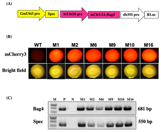 mCherry3 (mCh3) expression in transgenic soybean seeds. (A) Schematic diagram of the JGT44 T-DNA (Spec: spectinomycin resistance; mCh3: mCherry3; Rluc: Renilla Luciferase; Bag4: Arabidopsis derived Bcl-2-associated athanogene 4; GmUbi3, AtUbi10, and db35S: promoters), (B) Representative mCherry3 fluorescence images of dry mature seeds of wild type (WT) and JGT44 transgenic lines (M1, M2, M6, M9, M10 and M16), (C) PCR analysis of genomic DNA of putative transgenic soybean plants using BAG4 gene and Spec gene primers. The length of PCR productions is 681 bp and 550 bp, respectively. M: DNA ladder; P: JGT44 gDNA; N: Wild type soybean gDNA; M1, M2, M6, M9, M10, and M16 are representative transformed soybean plants.