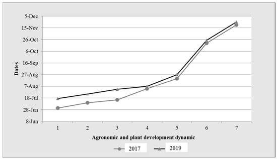 The dynamics of the establishment of cover crops of oats and white mustard in 2017 and 2019. Note: 1. Stubble destroyed; 2. emergence of >50% of oat plants (BBCH 09); 3. sowing white mustard; 4. emergence of >50% of white mustard plants (BBCH 09); 5. land cover establishment (80%); 6. the beginning of flowering of white mustard (BBCH 60); 7. cover crop destruction (BBCH 63).