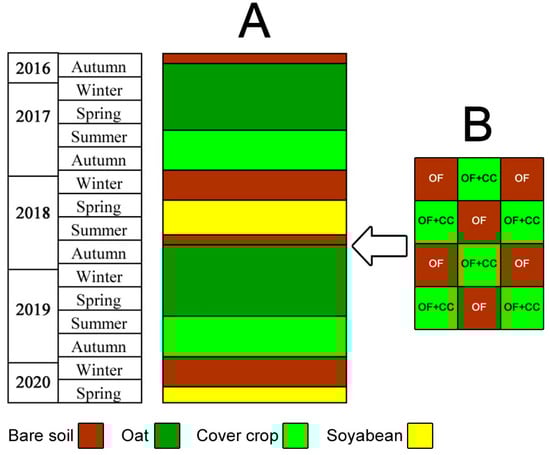 The scheme of the crop rotation (A) and experimental plots (B) with cover crop (OF + CC) and the control (OF).