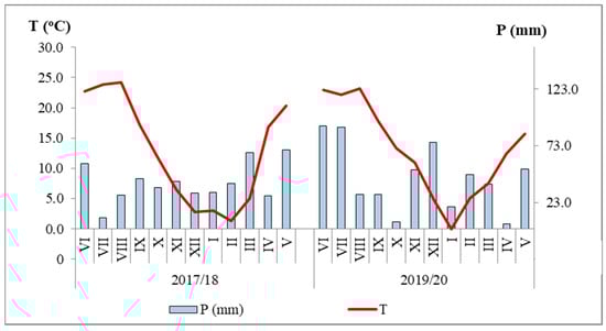 Data from the Meteorological Institute of Serbia were used to analyze the amount and distribution of precipitation, as well as the thermal regime during the monitoring experiment for the Pancevo location in both study years (Figure 4).