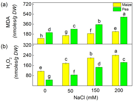 The application of NaCl (50–200 mM NaCl) leads to an increase of the oxidative stress markers (MDA and H2O2) in the studied plant species (Figure 1). According to the experimental data, there was a greater increase in both oxidative markers in pea compared to maize. Following the treatment of samples with the highest NaCl concentration (200 mM), the content of MDA increased by 134% in pea and by 117% in maize, while the H2O2 content increased by 299% and 110% in pea and maize, respectively.