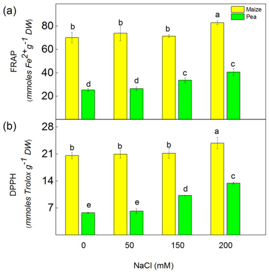 Total antioxidant activity (FRAP) (a) and free radical scavenging activity (DPPH) (b) in maize (Zea mays L. Method) and in pea (Pisum sativum L. Ran 1) after NaCl treatment for 5 days. Mean values (±SE) were calculated from 8 independent measurements. Different letters indicate significant differences among variants for respective parameters at p < 0.05.