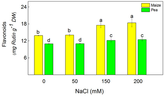 The total flavonoid content in maize (Zea mays L. Method) and in pea (Pisum sativum L. Ran 1) after NaCl treatment for 5 days. Mean values (±SE) were calculated from 8 independent measurements. Different letters indicate significant differences among variants at p < 0.05.