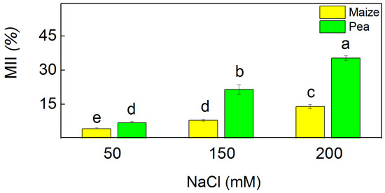 The membrane injury index (MII) was used to assess the membrane damage after treatment with different NaCl concentrations (Figure 4). This index was enhanced after salt treatment in both studied plant species. The application of the highest NaCl concentration resulted in a larger increase of the MII in pea (35%) than in maize (14%).