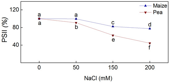 The electron transport mediated by PSII in the presence of the electron acceptor BQ (H2O → BQ) was established to assess the photochemical activity of PSII [26,39]. The results showed inhibition of PSII-mediated electron transport in the two studied species after treatment with NaCl (Figure 5). Inhibition of this process was observed in pea after applying all studied NaCl concentrations (50 mM–200 mM), while in maize, it was observed after the addition of higher concentrations (150 mM and 200 mM). Data also revealed the degree of inhibition in the two species was different, i.e., the inhibition in pea was greater than in maize (at 150 mM NaCl with 20% and at 200 mM with 34%) (Figure 5).