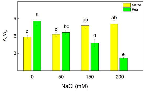 The dark relaxation of chlorophyll fluorescence excited by a single saturating light characterizes QA reoxidation [40]. The fluorescence signal was fitted with two components (fast A1 and slow A2) with times t1 and t2, which characterize two pathways of QA reoxidation [35]. The data also revealed that the impact of the high salt concentrations (150 mM and 200 mM NaCl) on the ratio A1/A2 in the studied species was different, i.e., this ratio increased in maize and decreased in pea (Figure 6). In addition, the data revealed that after applying the highest NaCl concentration, the component A1 decreased in pea by 56% and increased in maize by 14% (Table S1). The time t1 increased by 30% in maize and by about three-fold in pea. An increase of time t2 was also registered in pea (Table S1).