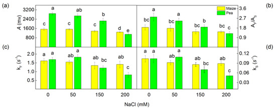 The influence of the different NaCl concentrations of the oxygen evolution under continuous illumination of isolated thylakoid membranes from leaves of maize (Zea mays L. Method) and pea (Pisum sativum L. Ran 1) after NaCl treatment for 5 days: (a) the amplitude of oxygen evolution under continuous illumination; (b) the ratio of fast to slow components (AF/AS); (c,d) the rate constants (kF, kS) of oxygen evolution under continuous illumination. Mean values (±SE) were calculated from 8 independent measurements. Different letters indicate significant differences among variants for respective parameters at p < 0.05.