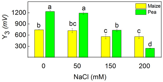 The flash oxygen yield (Y3) of isolated thylakoid membranes from leaves of maize (Zea mays L. Method) and pea (Pisum sativum L. Ran 1) after NaCl treatment for 5 days. Mean values (±SE) were calculated from 8 independent measurements. Different letters indicate significant differences among variants at p < 0.05.
