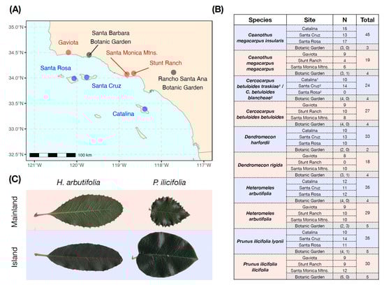 (A) Map of sampling locations for field and botanic garden leaf collection of chaparral shrubs. Island locations are shown in blue, mainland locations are in red, and botanic garden locations are in grey. (B) Table showing the number of plants sampled across each combination of species x site. All species were sampled from all sites, with the exception of C. betuloides from Santa Rosa Island. Parenthetical values refer to sampling from Rancho Santa Ana Botanic Garden and the Santa Barbara Botanic Garden, respectively. (C) Examples of leaves from island and mainland populations of Heteromeles arbutifolia and Prunus ilicifolia. Note reductions in marginal spines in both species.